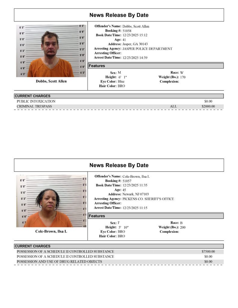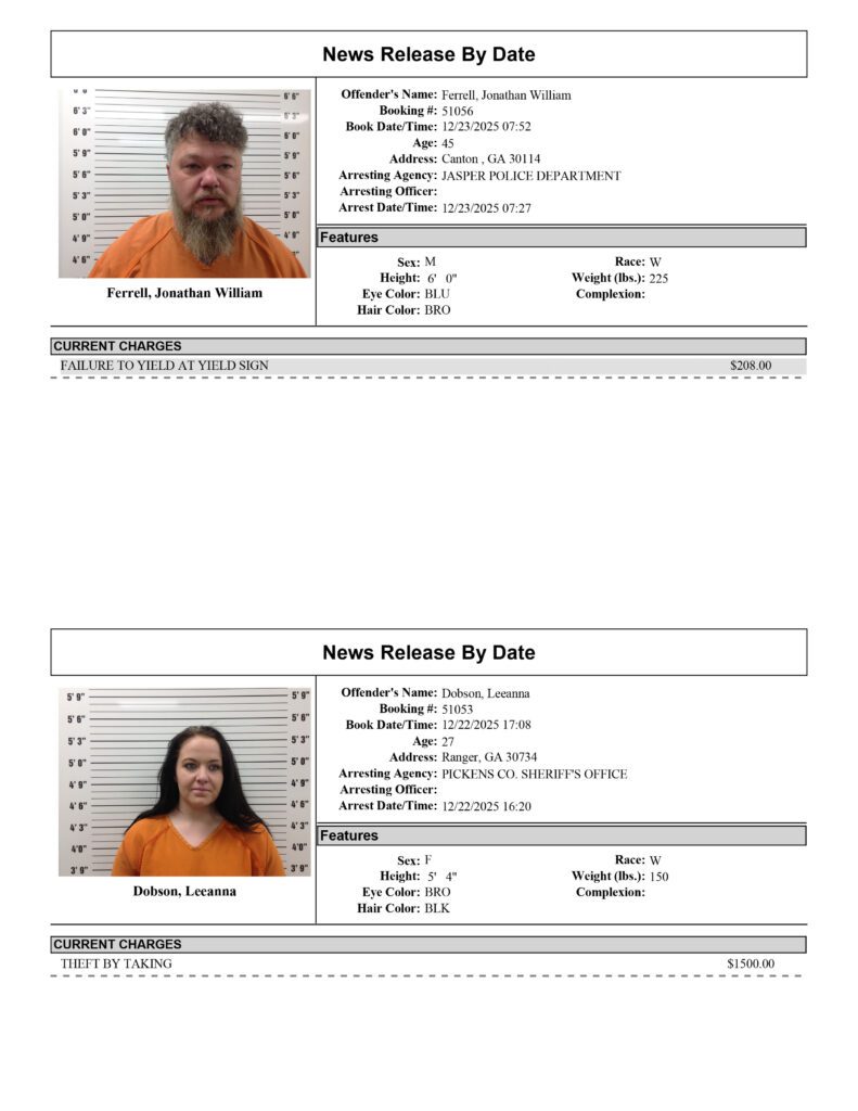 Pickens County Sheriff’s Office Arrest Report 12/21 – 12/28/2025