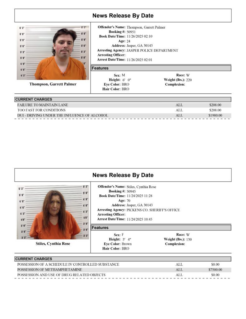 Pickens County Sheriff’s Office Arrest Report 11/16 – 11/23/2025