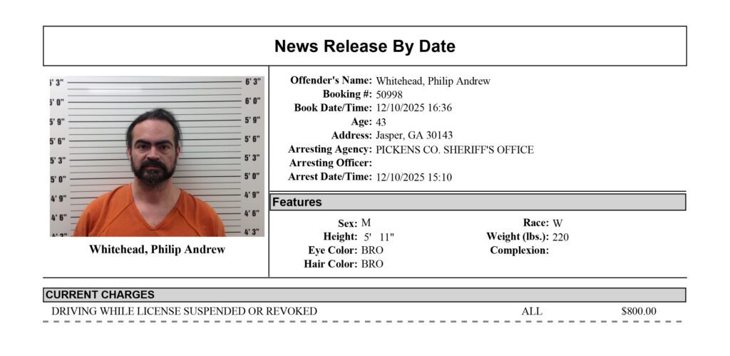 Pickens County Sheriff’s Office Arrest Report 12/7 – 12/14/2025