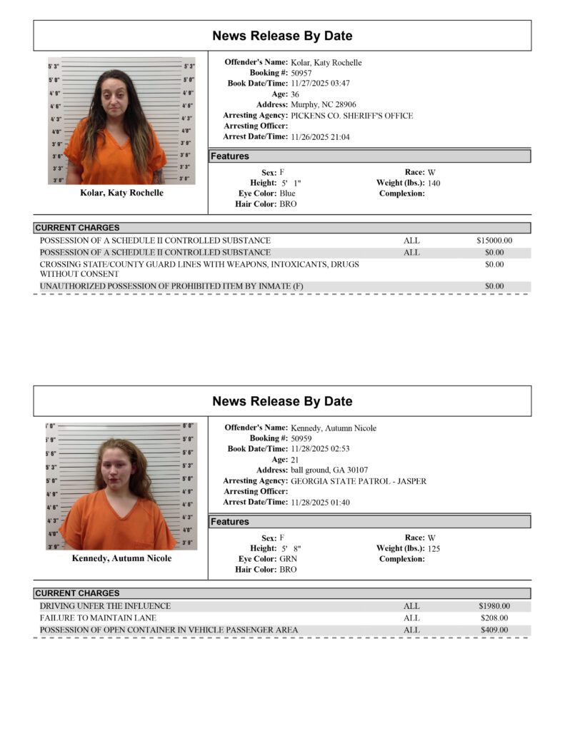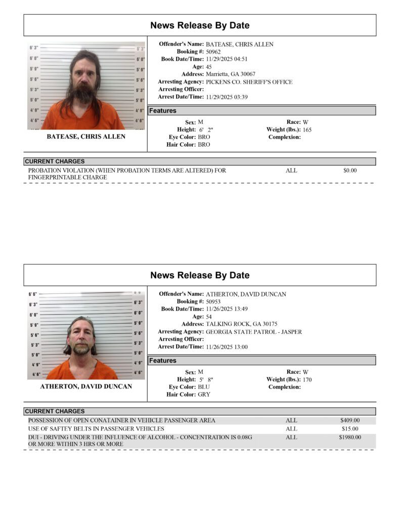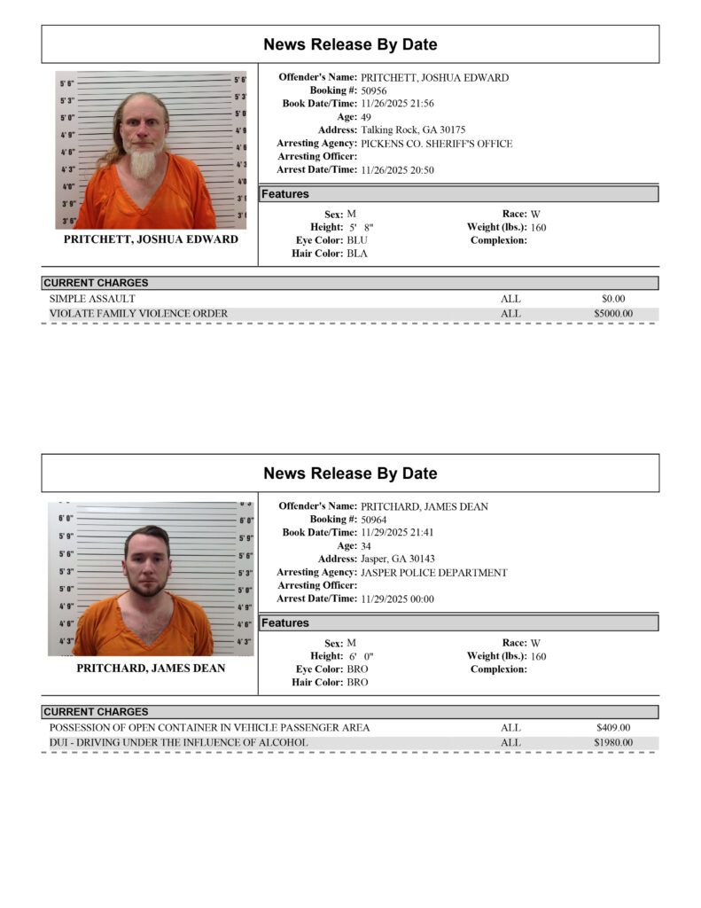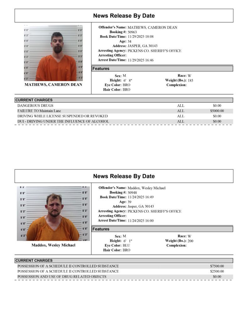 Pickens County Sheriff’s Office Arrest Report 11/23 – 11/30/2025