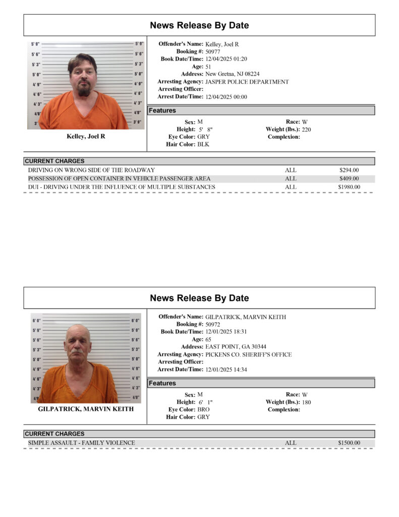 Pickens County Sheriff’s Office Arrest Report 11/30 – 12/7/2025