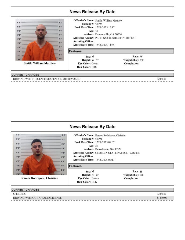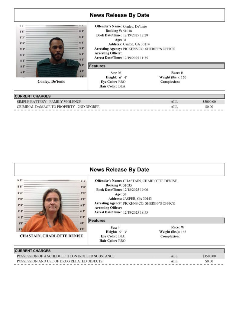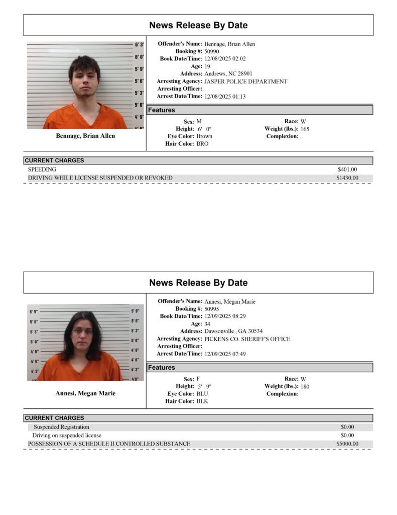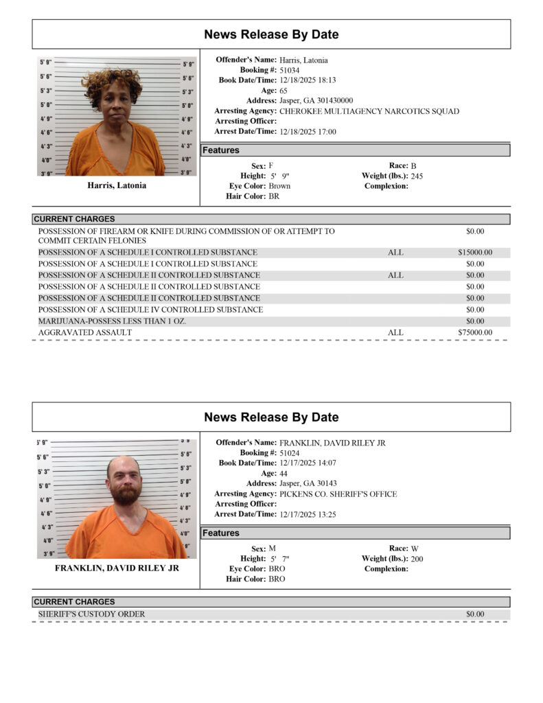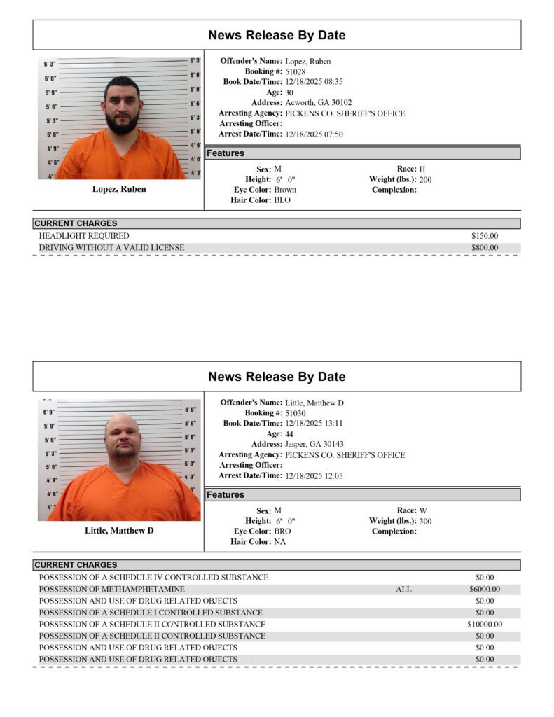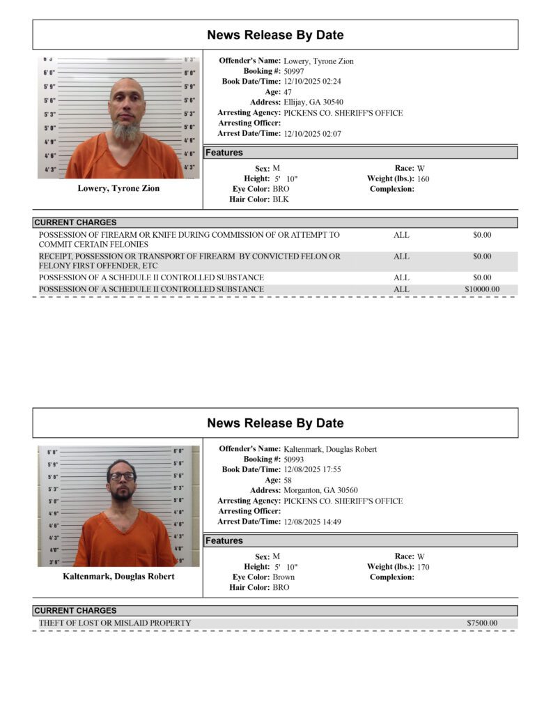 Pickens County Sheriff’s Office Arrest Report 12/7 – 12/14/2025