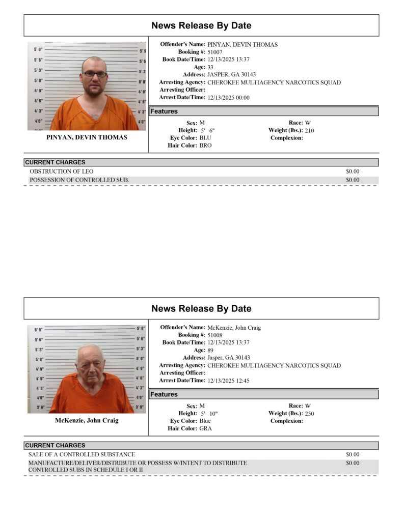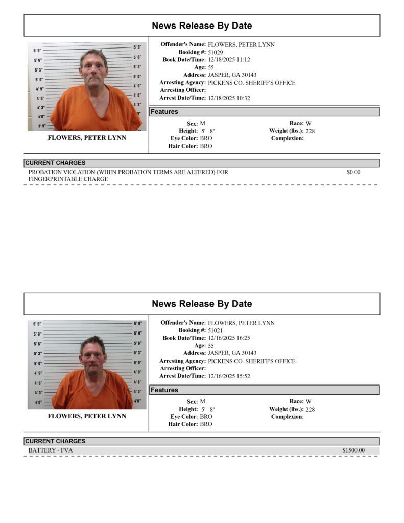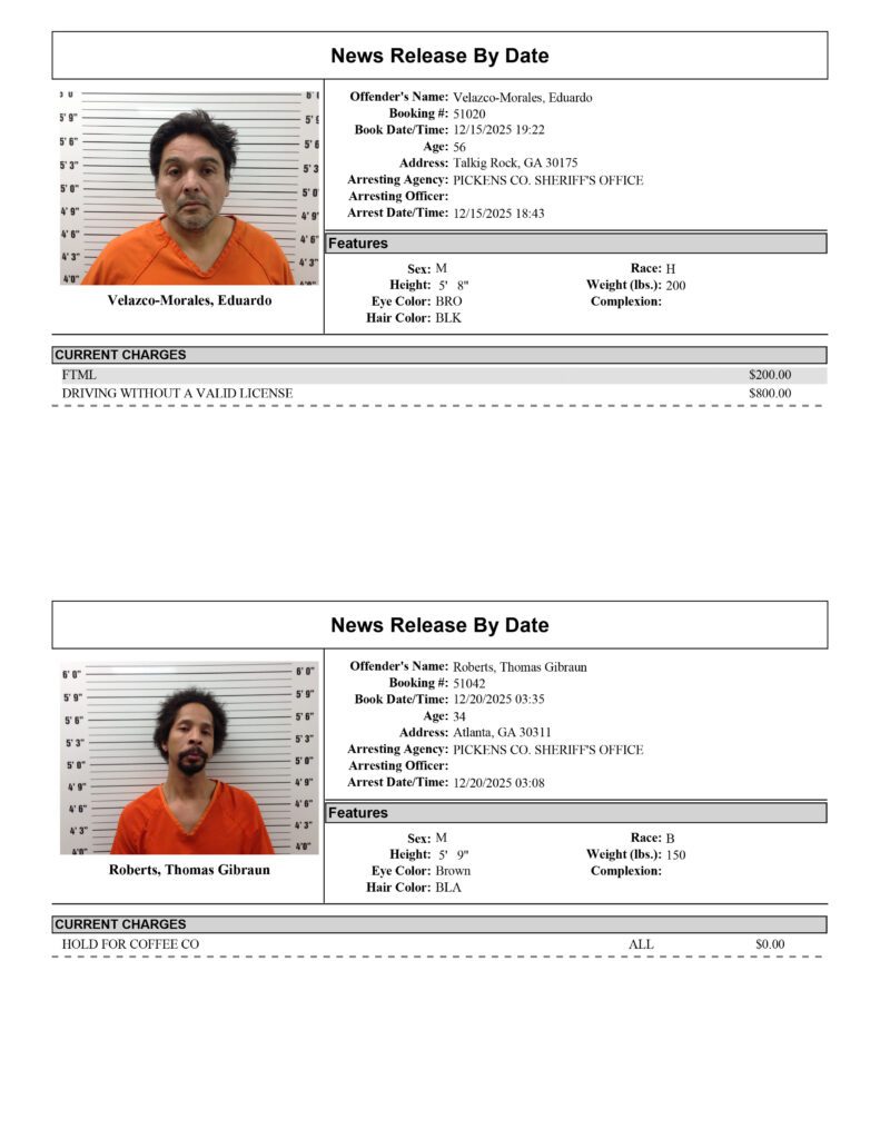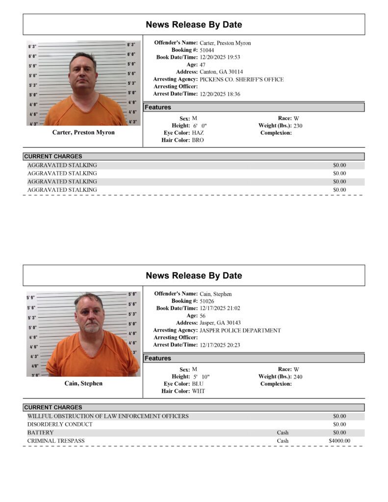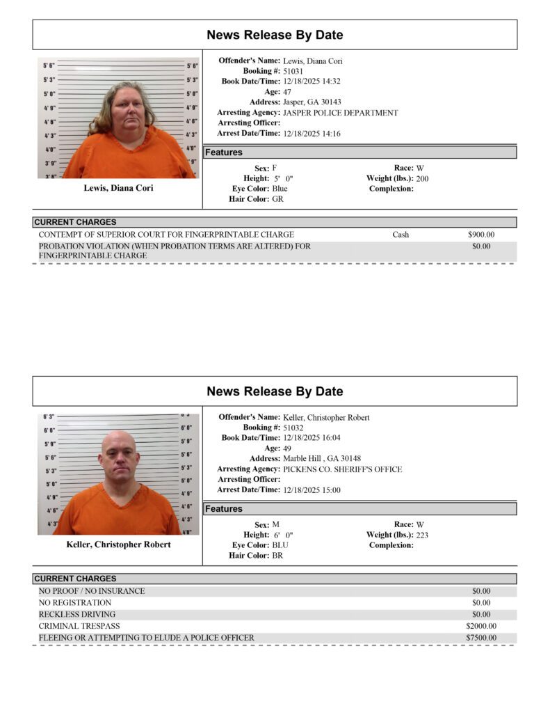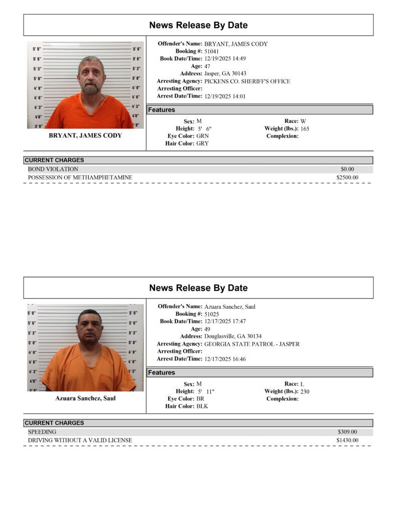 Pickens County Sheriff’s Office Arrest Report 12/7 – 12/14/2025