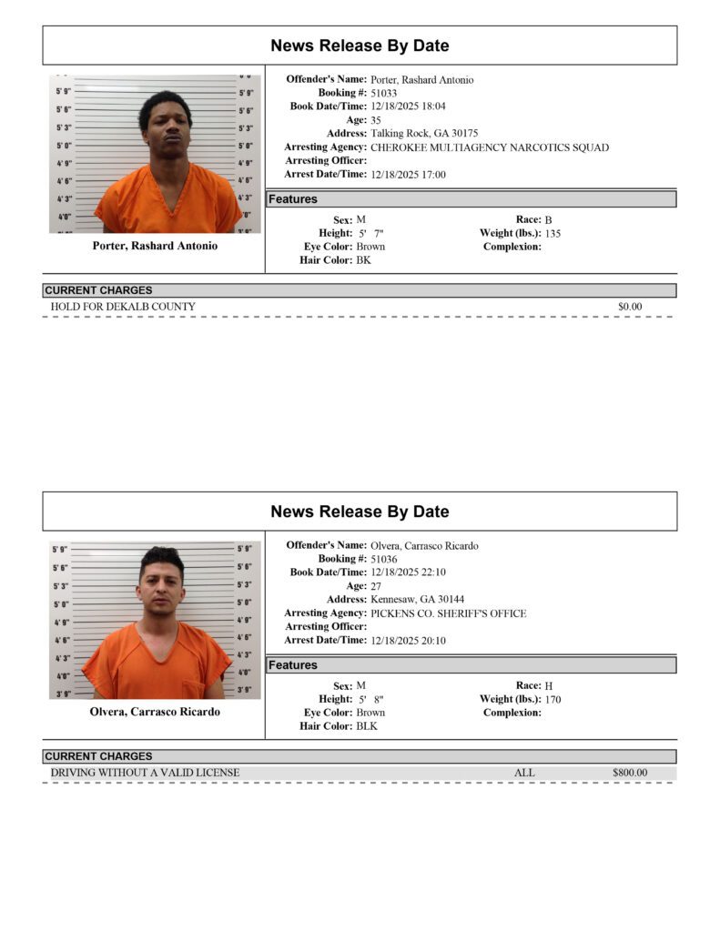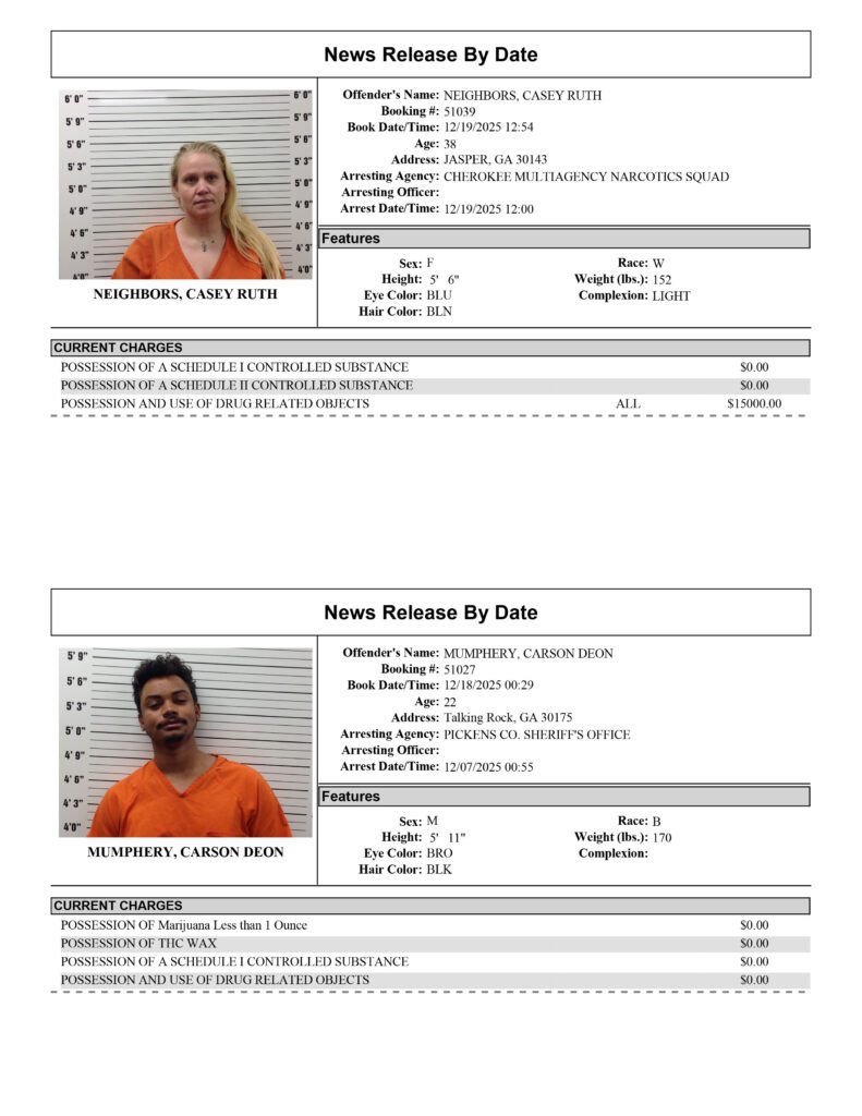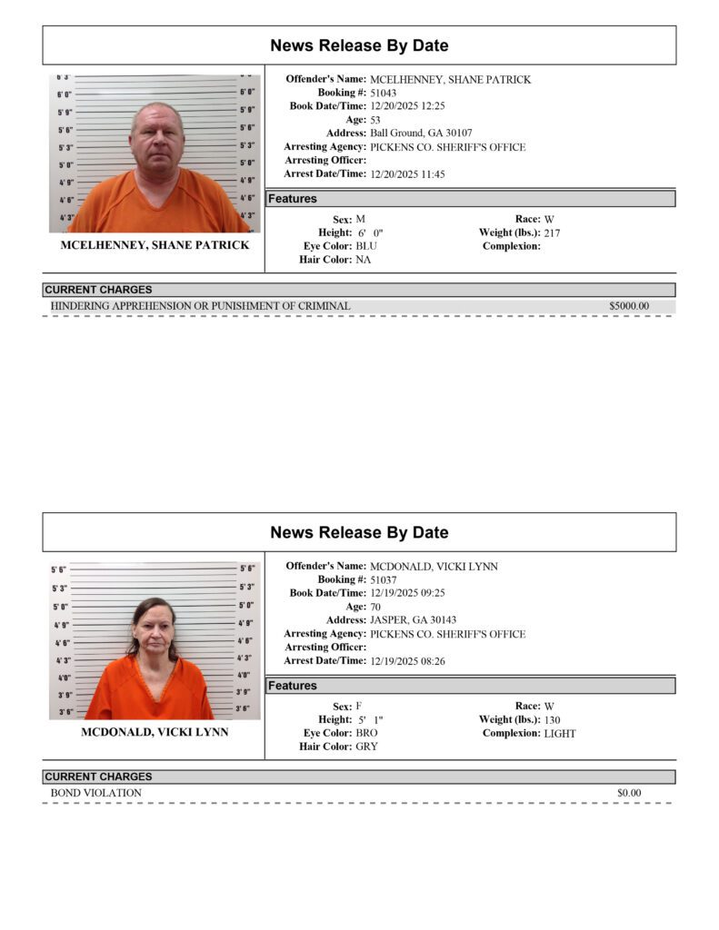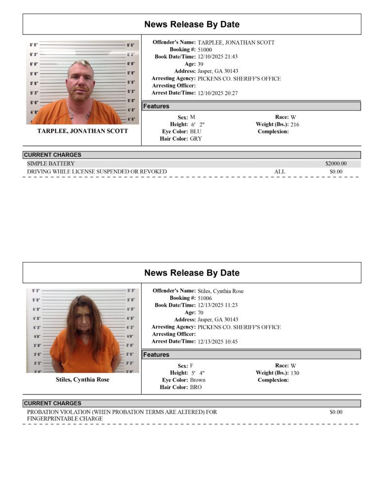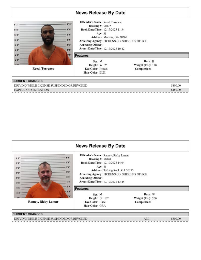 Pickens County Sheriff’s Office Arrest Report 12/14 – 12/21/2025
